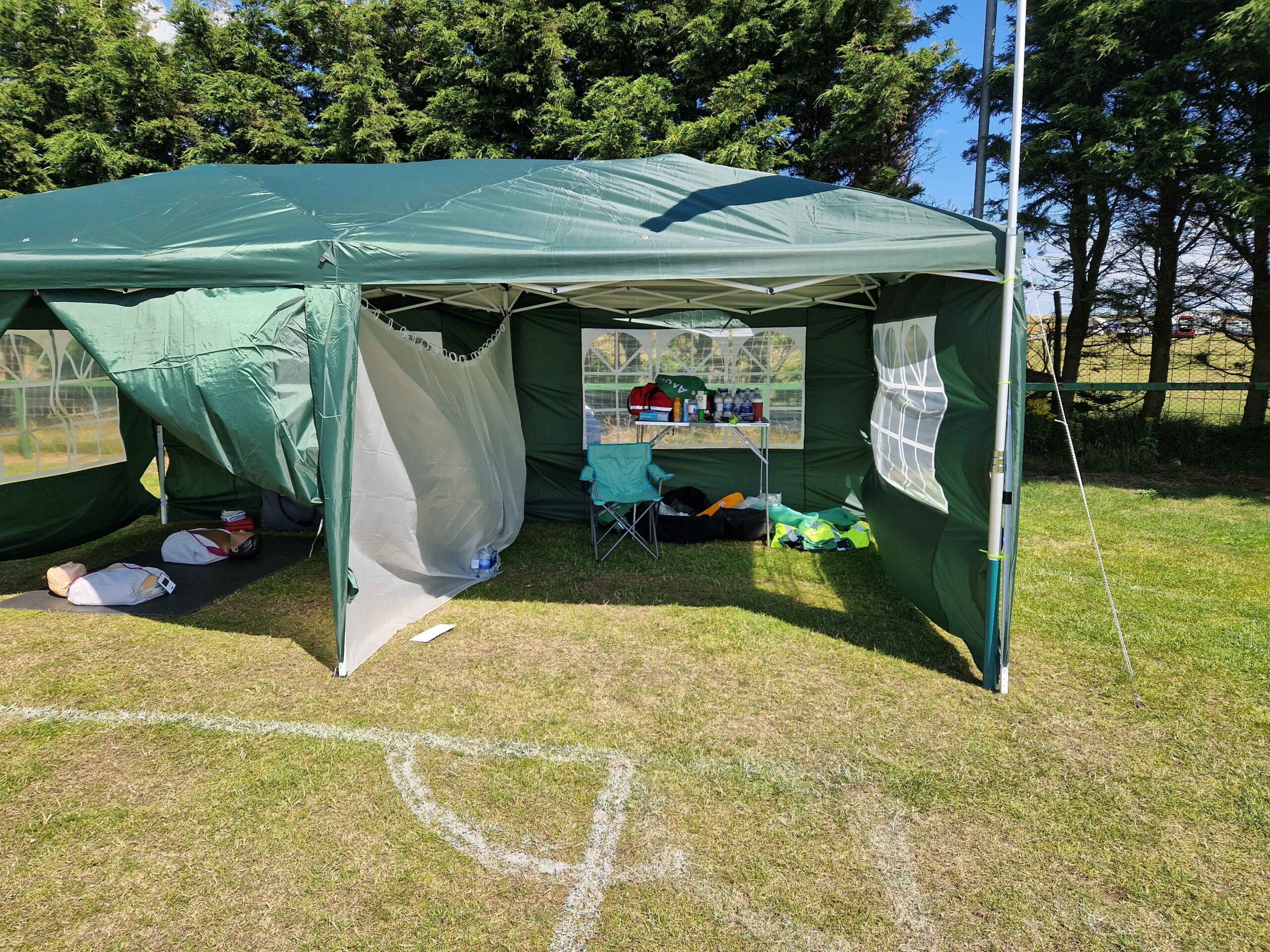 We have bags of bandages and other first aid supplies. We can provide shelter from the elements and welfare services in the form of a place to recuperate, bottled water, and suntan lotion.